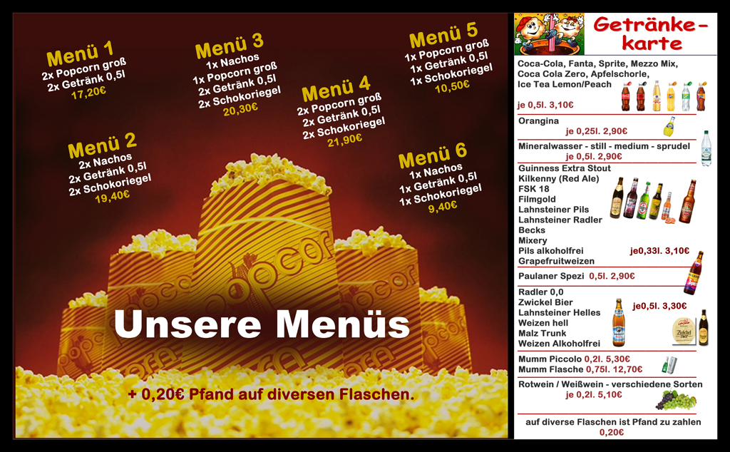 *Den ermäßigten Preis erhalten Kinder bis 10 Jahren bei allen Filmen mit FSK 0 + 6 jeweils vor 18:00Uhr, Schüler, Studenten, Menschen mit Behinderung ab 50%. Sowie freiwillige Helfer des „THW“, „DRK“, „FFW“, „DLRG“, „ASB“, „JUH“ und „MHD“. Für den Erhalt der Ermäßigung legen Sie bitte rechtzeitig beim Kartenkauf den entsprechenden Nachweis vor. |