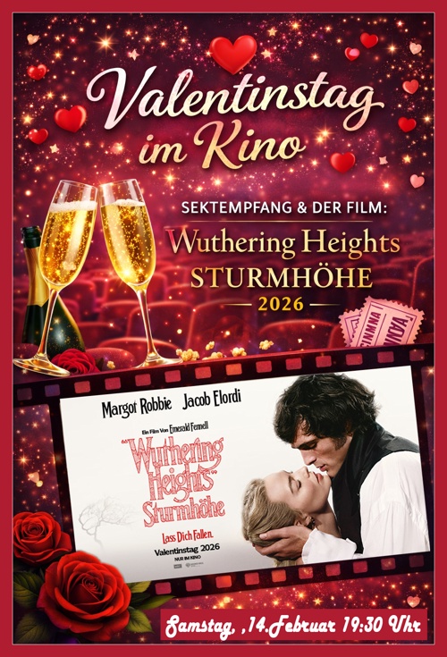 | >>> VALENTINSTAG <<< "WUTHERING HEIGHTS" - STURMHÖHE Eine leidenschaftliche und turbulente Liebesgeschichte vor der Kulisse der Yorkshire-Moore, die die intensive und zerstörerische Beziehung zwischen Heathcliff und Catherine Earnshaw beleuchtet. | Kino 1 | 19:30 | FSK: FSK folgt / 134 Min. |
